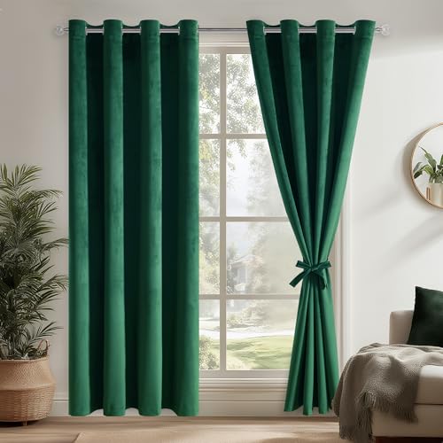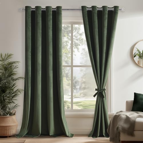 DWCN grön termisk gardin i sammet gardiner öljetter set om 2 stycken H 225 x 132 cm med gardinslipsar, mjuka köldskydd gardiner ogenomskinlig sammetsgardin för gardiner vardagsrum sovrum tjock termisk