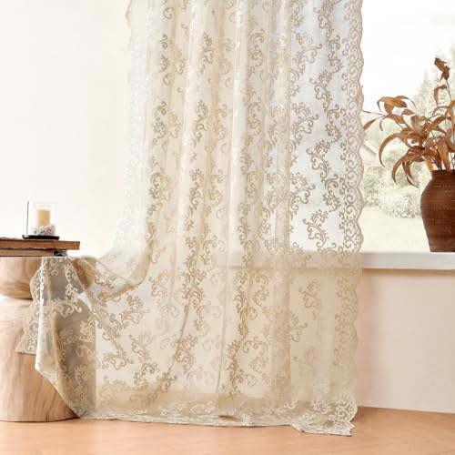 ALIGOGO Elfenben spets genomskinliga gardiner 213 cm långa 2 paneler – fina shabby chic gardiner för vardagsrum 2 paneler stång ficka 132 B x 213 L cm, elfenben