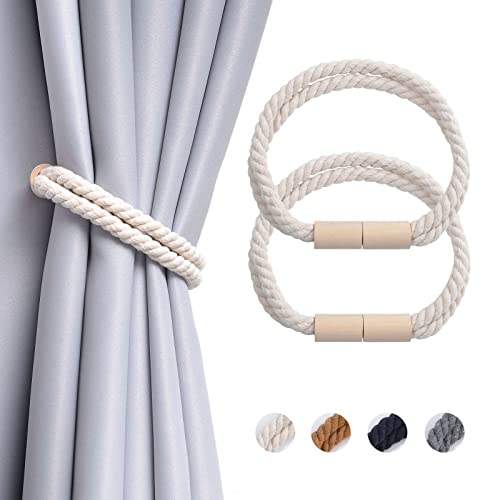 Pretty Jolly 4-pack magnetiska gardinbindningar i trä boho heminredning draperi bakstycken naturlig bomull handgjorda rep gardinhållare för tunt eller tjockt hem och kontor fönsterdraperi (beige)