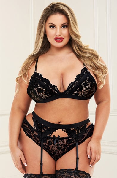 Baci Lingerie 3pc Lace Garter Set Black - Queensize