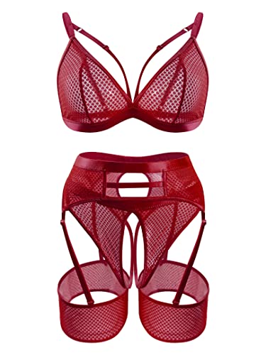 popiv Women Sexy Lingerie Set Cutout Bra and Panty Sets Garter Lingerie 4 Piece Burgundy