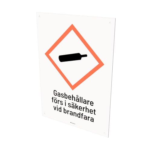 Nosico, Varningsskylt A4 - Gasbehållare förs i säkerhet vid brandfara, 1,5 mm Aluminium, 1-pack, Svenska, Förborrade Skruvhål, Vit/Röd/Svart, 29,7(L) x 21,0(B) cm