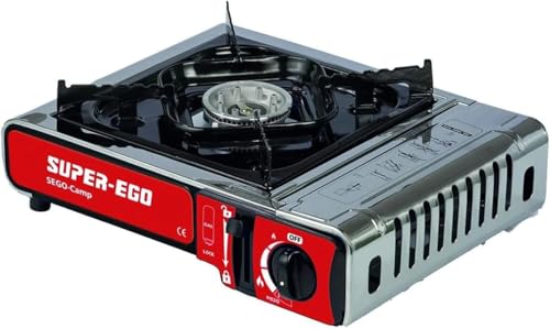Super-Ego bärbar butangasspis campingkök inklusive gasspis, bärväska och presentskruvmejsel, anpassad till den nya standarden EN-17476. Inkluderar inte gasbehållare
