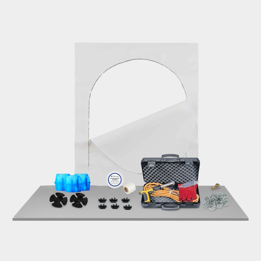 Express Krympplastningspaket med värmepistol 90 kWh, gasoldriven, brännare + slang skyddshandskar väska VG-band krympplasttejp ventiler dörr avlastningsplattor torkboxar