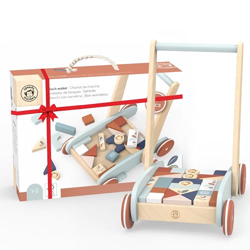 Speedy Monkey SP1005 gåvagn med byggstenar och bromssystem för ökad säkerhet 34,9 x 24,9 x 40 cm färgglad, träleksak för barn, kärleksfulla detaljer-bra presentidé