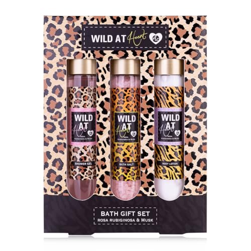Accentra Badset WILD AT HEART gåvoset med djurmönster, leomönster, i gåvobox, duschgel, bodylotion, badsalt, doft: Nypon & Muskus, julklapp kvinnor