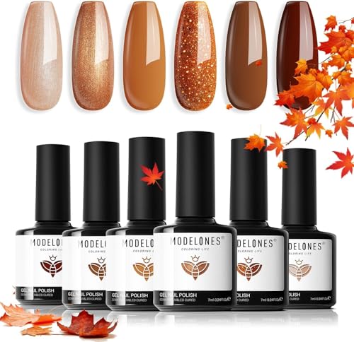 modelones Gel Nail Polish Set, 6 Colors Gel Polish Kit Pearl Nude Brown Shimmer Glitter Orange Red Nail Polish Gel, All Seasons Nails Soak OFF LED Gel Nail Kit Manicure Nail Art Salon DIY Gift