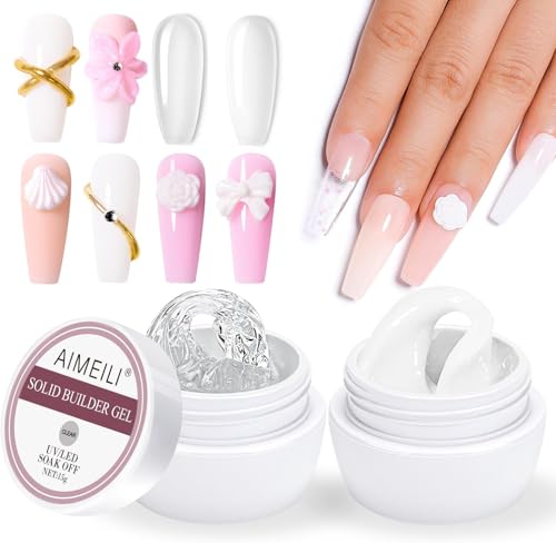 AIMEILI Solid Builder Gel for Nails, Clear White Nail Extension Gel Solid Sculpture Gel UV LED Hard Gel for Nails, Nail Carving Gel, Rhinestones Glue Gel for Nail Art Salon Home Use (2X15g)
