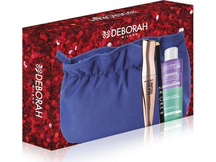 Deborah Set Deborah: 24 Ore Extra, Gel Pencil Eyeliner, Black, 1.5 G + Dermolab Bifasico, Hyaluronic Acid, Makeup Remover Lotion, 50 Ml + Makeup Bag, Blue + Instant Maxi Volume, Volumizing, Mascara, Black, 11 Ml For Women