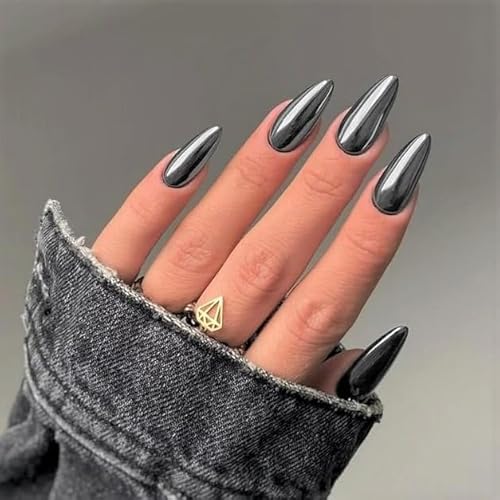Levimimo Pressa på naglar mandel - Svart kromglaserad press på naglar kort, Soft Gel Fake Nail med lim, Återanvändbara Stick On-naglar i 12 storlekar - 24 mjuka gelénaglar kit, Black Swan