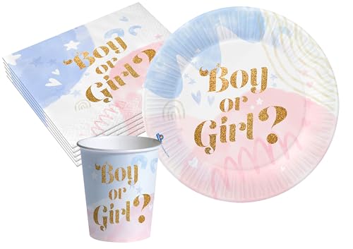 Party Tableware Set Gender Reveal Boy or Girl for 24 people (88 pcs: 24 plates Ø18cm, 24 cups 200ml, 40 napkins 33x33cm) in eco-friendly compostable paper