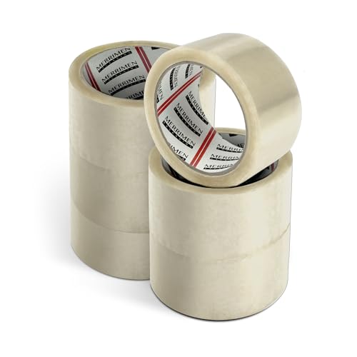 Merrimen Starkt slitstarkt rullpaket genomskinlig förpackningstejp | Säker klibbig tätningstejp för paketlådor, flyttlådor, stora postpåsar för långvarig förvaring | (48 mm x 66 m) (6 rullar, klar)