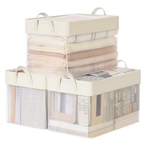 SONGMICS Set om 3 Förvaringslådor, Stora Förvaringskorgar, Tygförvaringslådor, Hopfällbar Låda, Genomskinlig Nylonnät, 50 x 30 x 30 cm, Handtag, Krämvit RFB950W01