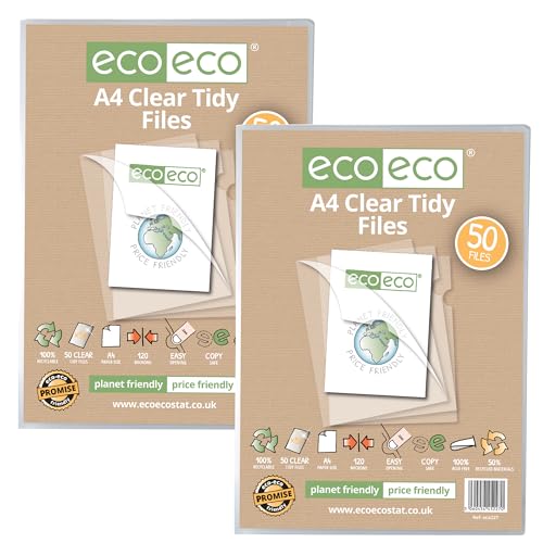 eco-eco A4 50% återvunnen påse 50 prydliga rapportfiler, 120 mikron öppen topp och sidoskydd filplånböcker genomskinlig skuren spolning, 2 paket med 25, eco226 x 2