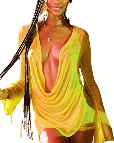 Dam sexig långärmad två 2 delar kläder genomskinlig nät mini klänning kjol set topp v-hals rygglös rynkad bodycon täcka upp, A-gult, M