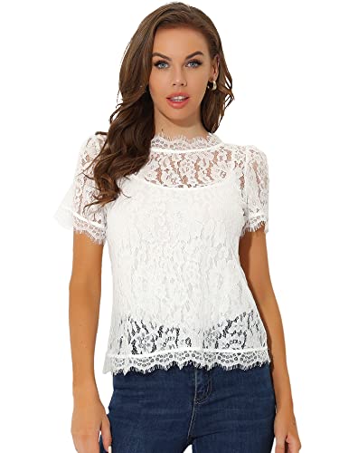 Allegra K kvinnors uddig trim genomskinlig halvren blommig spets topp, Vitt, 38