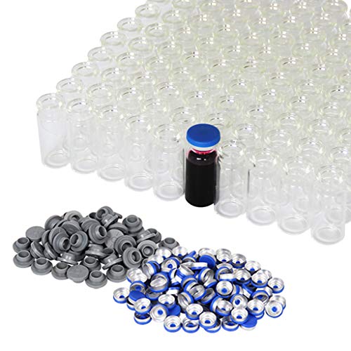 10 ml flaskor – transparent glasflaskor för huvudutrymme med plast-aluminium avfällbart lock och gummiproppar, 100-pack, 20 mm platt botten labb flaska (genomskinlig)