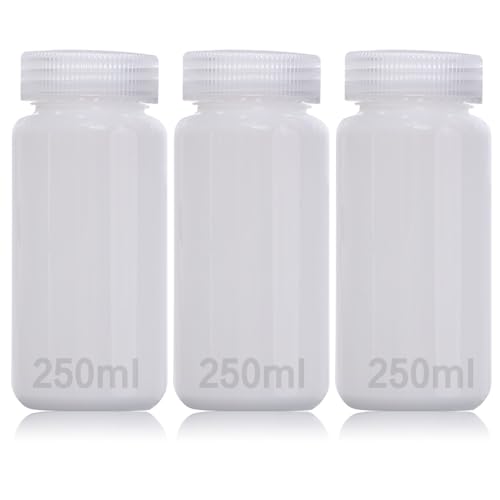 DKBT 3 stycken plastflaskor med bred hals, 250 ml, tom laboratorieflaska, läckagesäker genomskinlig från HDPE-flaska med bred öppning för pillerflaskor, vattenprovflaskor