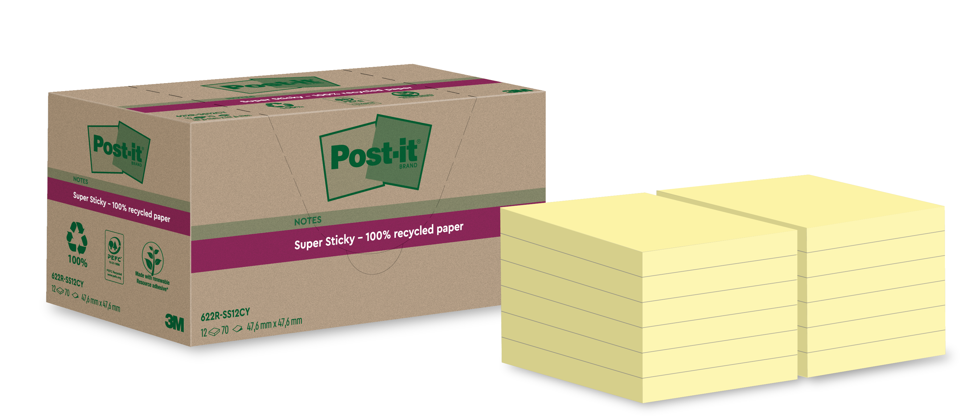 Post-it-lappar Post-it Recycled Gul, 47,6x47,6 mm, 12 block