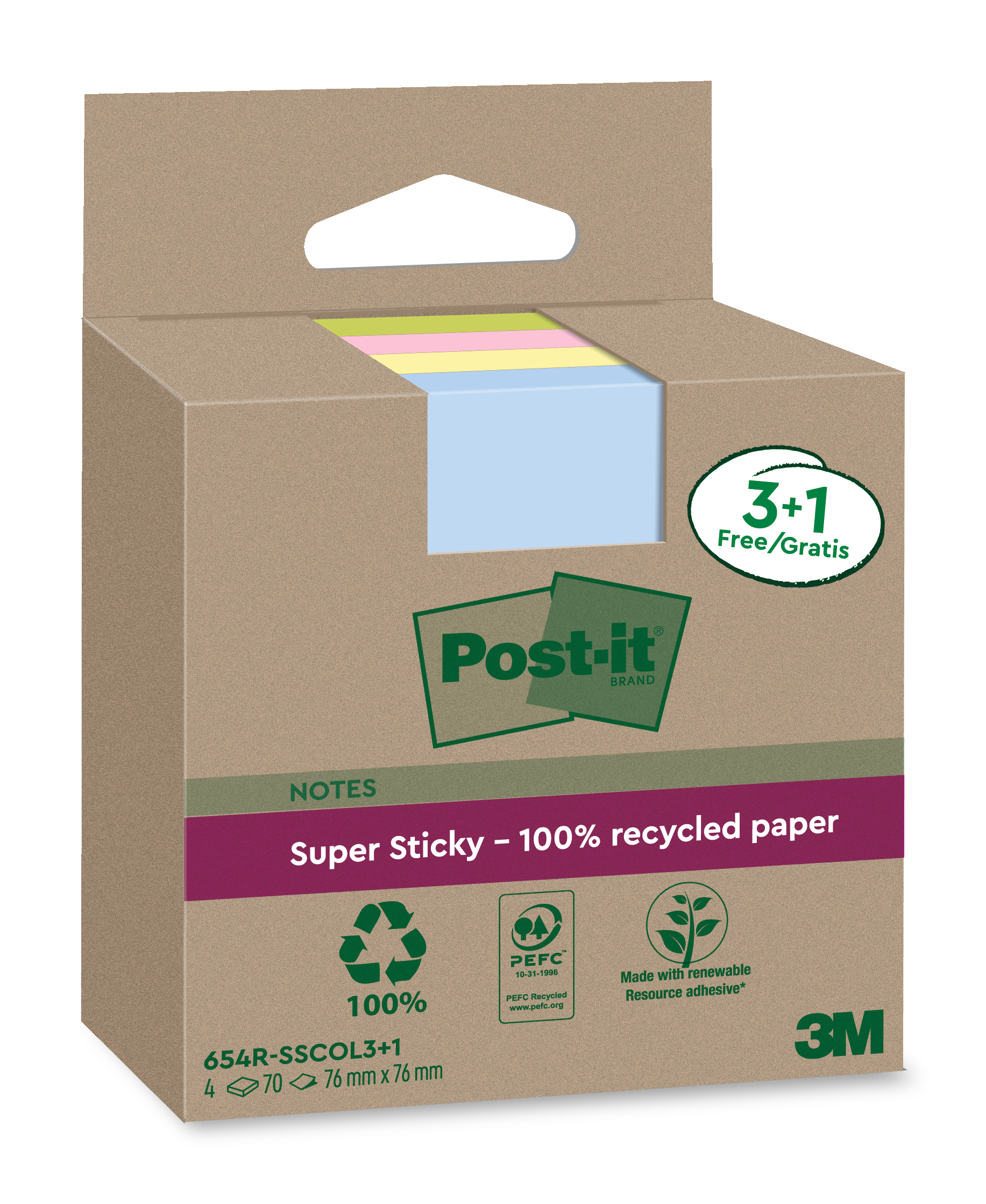 Post-it-lappar Post-it Super Recycled, 76x76 mm, 3+1 block, 280 ark
