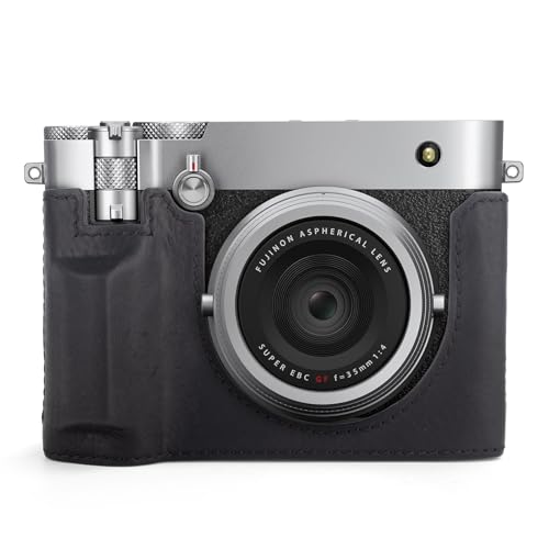 MUZIRI KINOKOO Fuji GFX100 RF fodral, äkta läder skyddande halvfodral kompatibel med Fuji GFX100 RF/GFX100RF digitalkamera - med öppningsbotten och handgreppsdesign - Svart