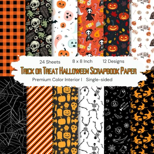 8 x 8" Trick or Treat Halloween Scrapbook Paper: Seasonal Designer Paper for Craft, Colorful Decorative Sheets for DIY Projects, Journaling, Albums, ... Ghost Spider Bat Theme Pattern, Single-sided