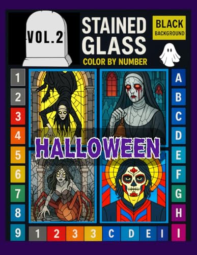 Halloween Stained Glass Color by Number for Adults and Teens: Creepy and Fun Designs Featuring Spider, Ghost, Skeletons, and Full Moons | Volume 2