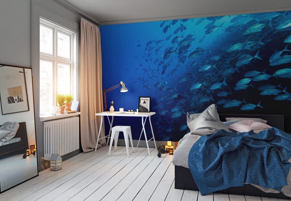 Fototapet -Giant trevally tuna caranx fish isolated on blue diving maldives - Tonårsrum - Scandiwall - Fisk