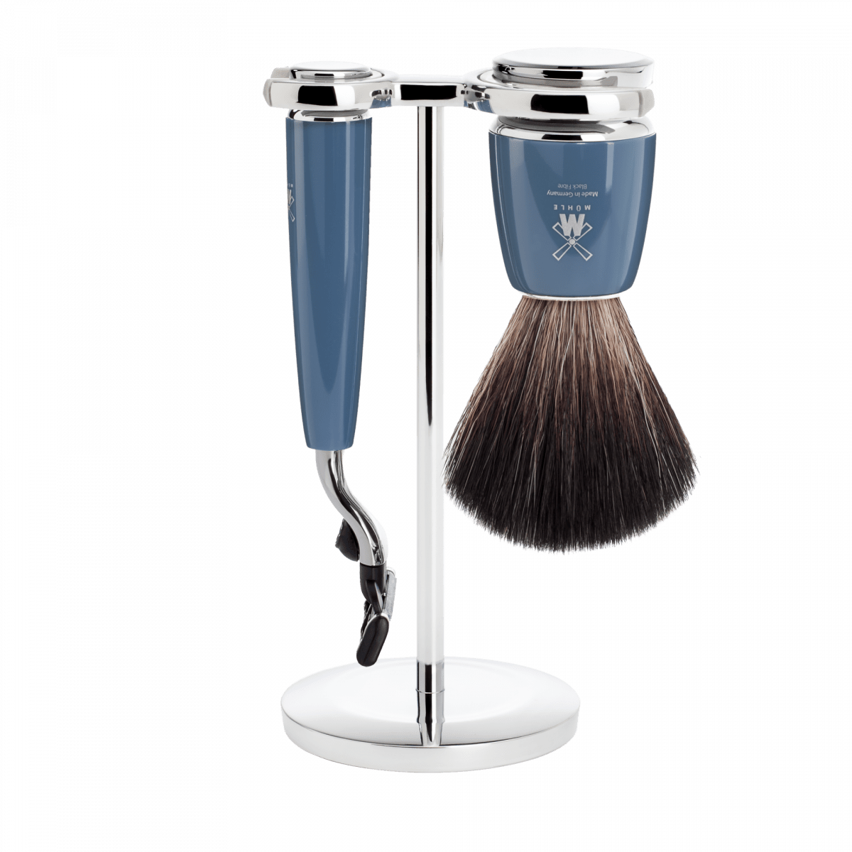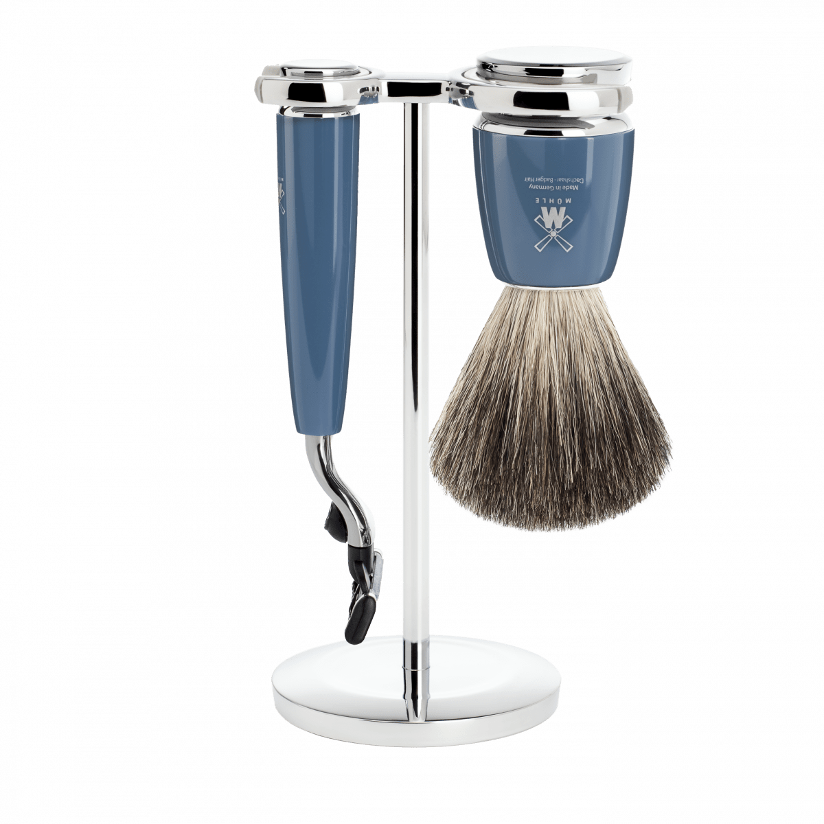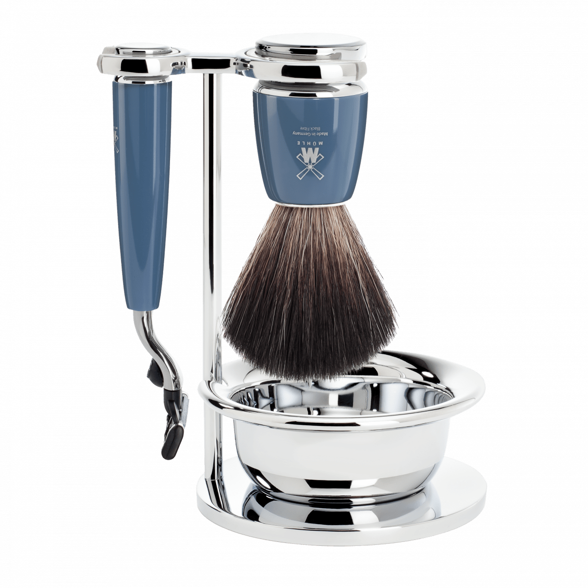Mühle RYTMO Rakset (Färg: Petrol/Blå, Rakborste: Black Fibre®, Ställ: Med skål, Rakhyvel: Gillette Mach3)
