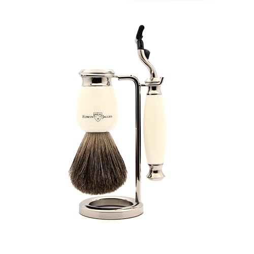 Edwin Jagger Rakning present set – Pure Badger Dachshaar-rakborste, Gillette Mach 3 rakhyvlar, nickelpläterade stativ, elfenbensininimitation, 1-pack (1 x 1 styck)