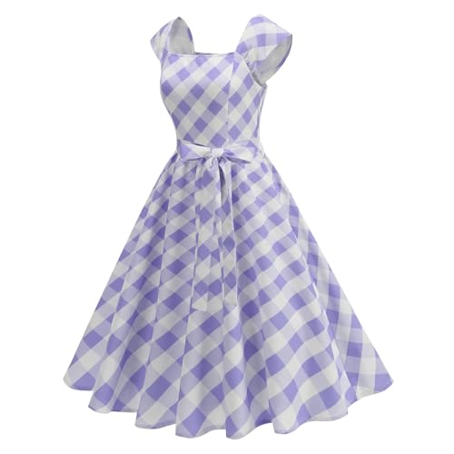 Damer sommar älva stil rutiga klänningar midi ärmlös midja rosett bomull kjol retro eleganta brudtärnor Gingham klänningar för kvinnor, Lila, XL