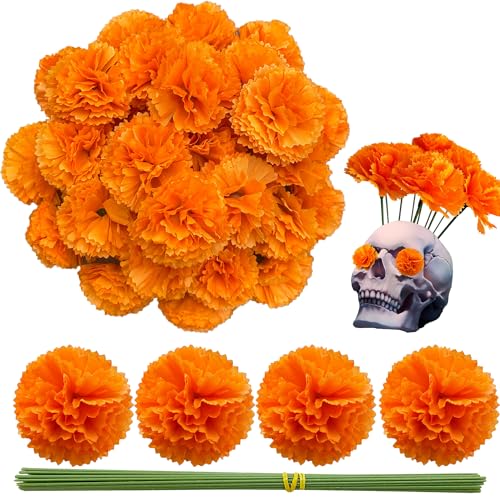 Hananona 50 st ringblomma huvuden bulk, silkesringblomma med stjälkar konstgjorda blommor för Diwali heminredning gör-det-själv krans girlang hantverk bröllopsfest dekoration halloween jul (orange,