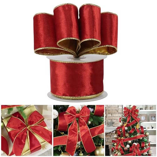 AIMUDI Rött sammetsband trådbundet 6,5 cm trådbundet band för kransar, julgran, presentförpackning, girlang, semesterhantverk, topprosetter – 10 meter, röd/guld