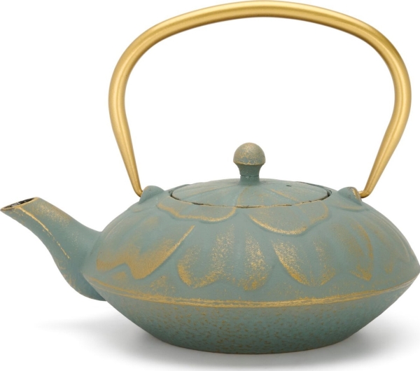 Bredemeijer blå platt asia tekanna 1,1 liter gjutjärn – asiatisk gjutjärnskanna med tefiltersil av rostfritt stål