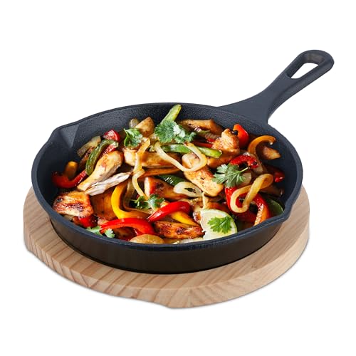 Relaxdays Gjutjärnspanna med träunderlägg, rund serveringspanna, för spis och grill, grillpanna, D 20 cm, antracit