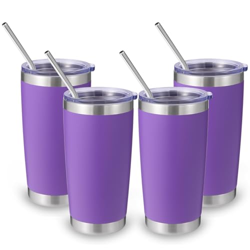 Volhoply 550 ml reseisolerat glas med lock och sugrör storpack 4-pack, dubbelvägg rostfritt stål kaffemugg passar mugghållare, pulverlackerade koppar för varma och kalla drycker, BPA-fri (lila, 4 set)