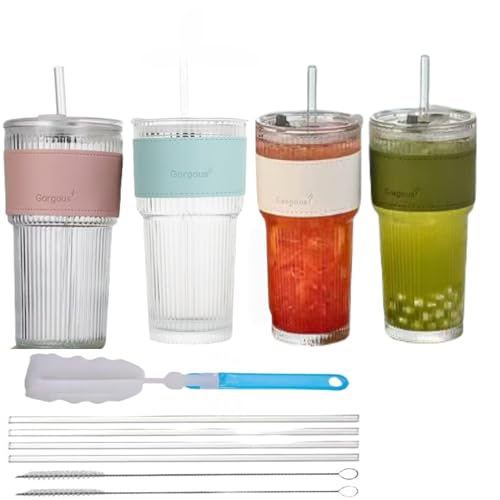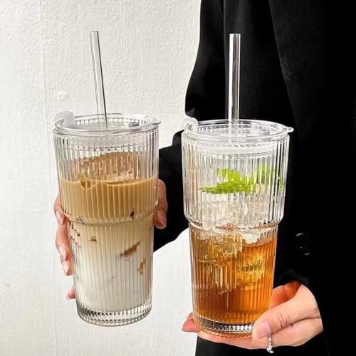 Yililay 2st glaskoppar med lock och sugrör ribbat vertikalt randigt glas kaffemugg med halm och lock i iskaffe mugg 375 ml