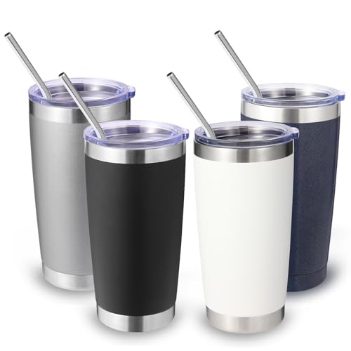 Volhoply 550 ml reseisolerat glas med lock och sugrör storpack 4-pack, dubbelvägg rostfritt stål kaffemugg passar kopphållare, pulverlackerade koppar för varma och kalla drycker, BPA-fri (mix, 4 set)