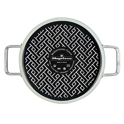 Magefesa Nordic kastrull 28 cm med dubbelskikt non-stick beläggning förstärkt med mintgrön yttre emalj och satin rostfritt stål hårdvara med platt lock i glas
