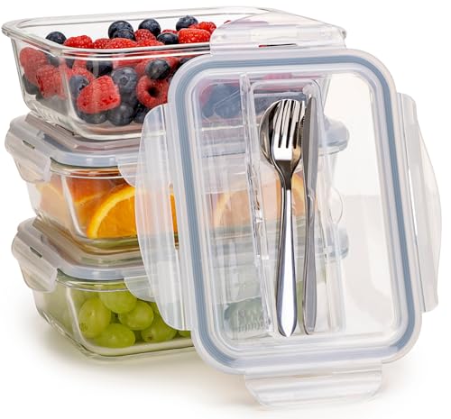 Igluu Matlåda i glas med 3-fack och lufttätt SnapLock – Portionskontroll för måltidsförberedelser – BPA-fri plast – Säker att använda i mikrovågsugn, diskmaskin, frys och ugn [3-pack]