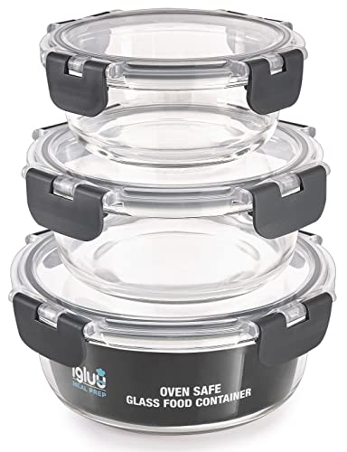 Igluu Matlåda - Set med 3 stapelbara runda matlådor i glas - måltidsförberedelser, säker att använda i frys, mikrovågsugn, ugn och diskmaskin, BPA-fria matlådor-Lufttätt SnapLock (Olika storlekar)