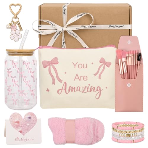 Presenter till flickor i åldrarna 9, 10, 11, 12, 13, 14 och 15: Födelsedagspresentset för flickor med glas, sugrör och lock, sminkborste, nyckelring, sminkväska och 5-i-1-armband