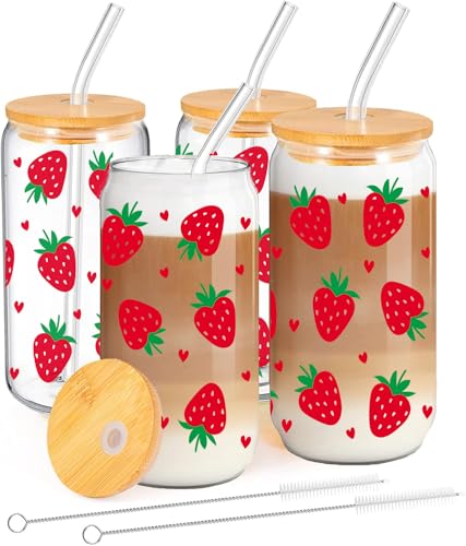 MEIMUCUL Jordgubbe dricksglas med sugrör och lock, 4 stycken ren tjej, aesthetiska glas med lock och sugrör, cocktailglas iskaffe glas 500 ml, glasmugg, present till syster, flickvän
