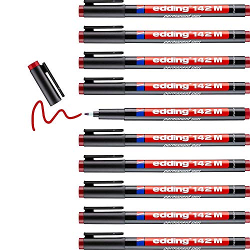 edding 142 M permanent penna – röd – 10 pennor – rund spets 1 mm – penna för att skriva på glas, plast, folie och släta ytor – permanent, snabbtorkande, fläckbeständig och vattentät