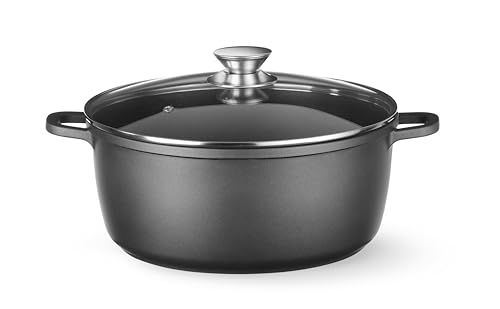 HENDI Stekpanna, med lock, lämplig för alla spisar, induktionsbotten, ugnssäker, non-stick, kastrull, serveringspanna, 7,5 L, 387 x 310 x (H) 130 mm, gjuten aluminium, glas, svart