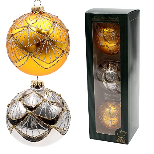 Dekohelden24 Lauschaer Julgransdekoration – uppsättning av 3 glasbollar i guld och antracit, munblåst och handdekorerade, med guldkronor, storlek Ø ca 8 cm, (KGL10852)