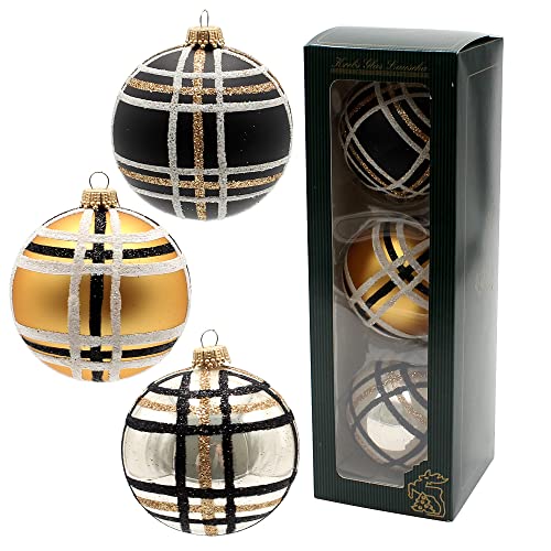 Dekohelden24 Lauschaer Julgransdekoration – uppsättning av 3 glasbollar i guld, svart och elfenben, munblåst och handdekorerade, med guldkronor, storlek Ø ca 8 cm, (KGL10833)