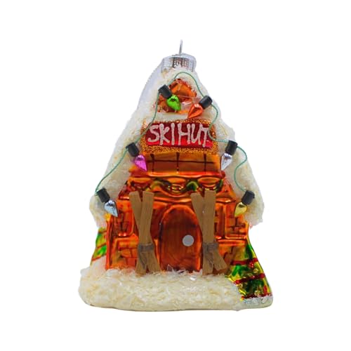 Dekorhjälten24 Lauschaer Julgransprydnad – julgranskulor bullerus, glasbollar, glasornament skidstuga, glashänge som vinterhus i vitt med färgglada detaljer, av lauscha, L/B/H 8 x 7 x 11 cm.