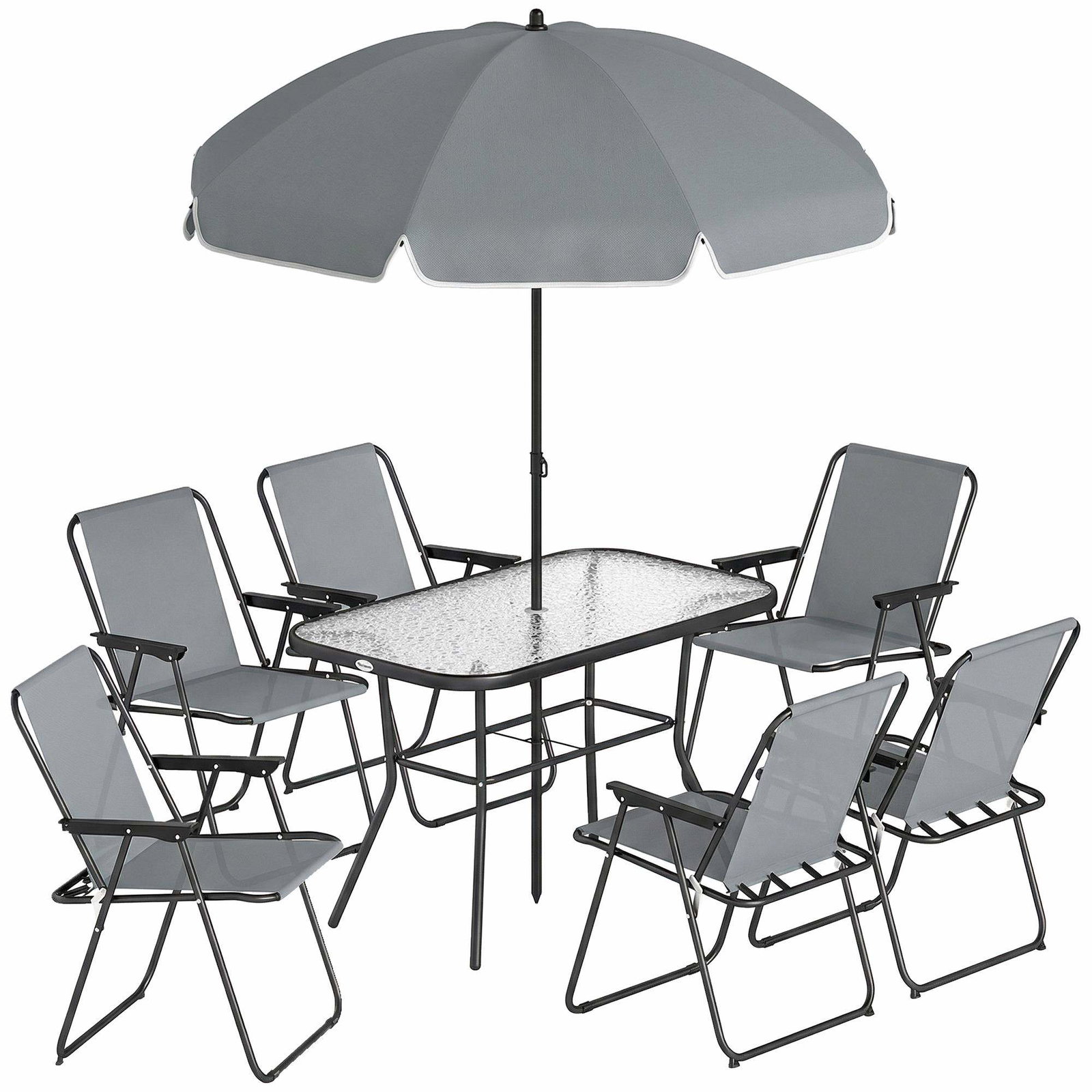 Matgrupp för utomhusbruk – Glasbord, 6 fällstolar, grå
