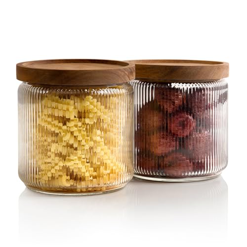 Mason & Fable ribbad glasburk med trälock 70 fl.oz- Uppsättning av 2 | Lufttät räfflad förvaringsbehållare för kakor, pasta, kaffe, hundgodis, mellanmål | Organisationsbehållare för hem och kök